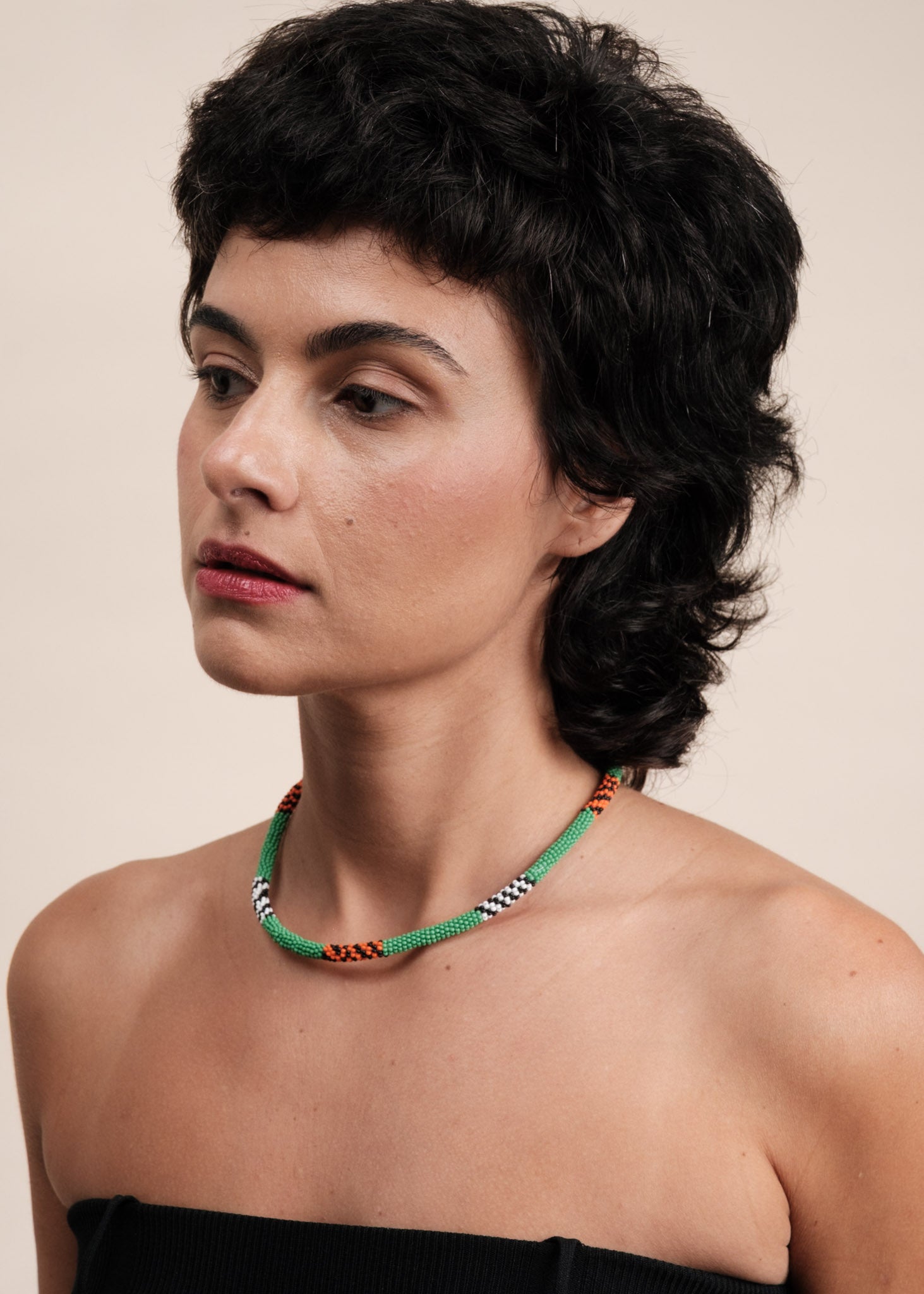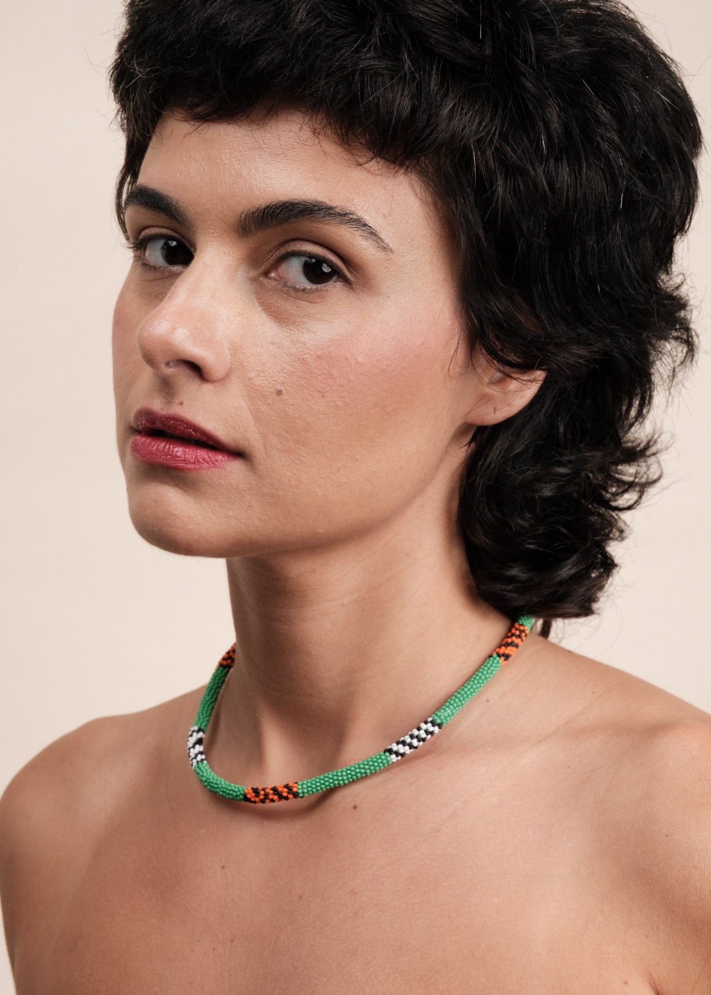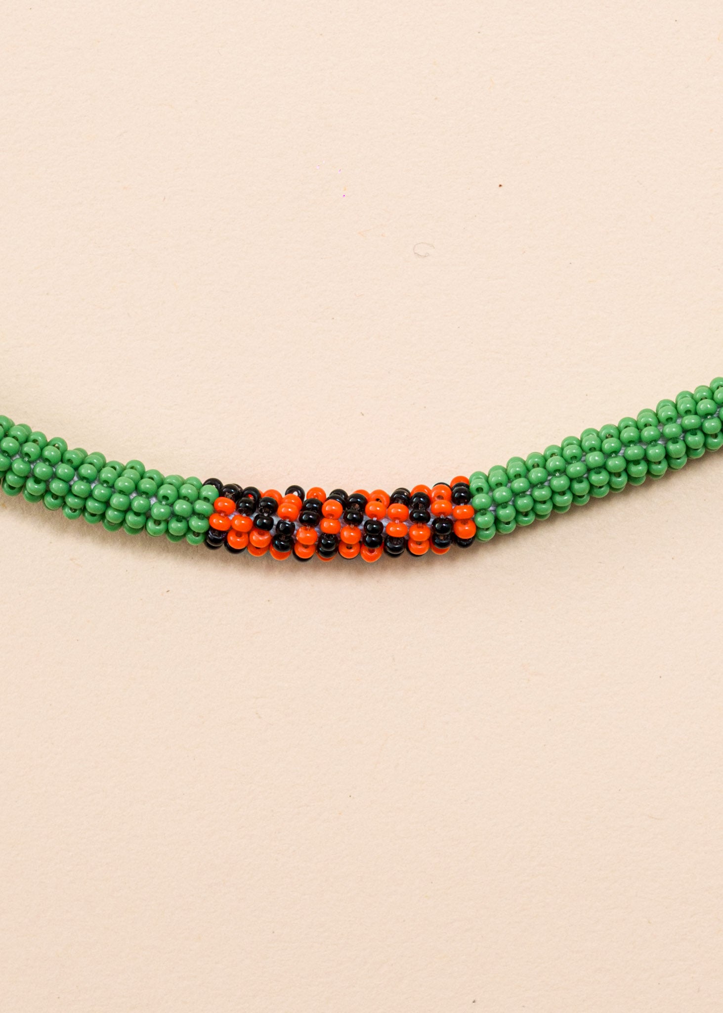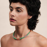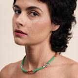 Feitas à mão, com duas linhas de nylon, miçangas de vidro, as joias refletem a beleza da floresta nos tradicionais grafismos do povo Mebengokré, autodenominação Kayapó.