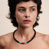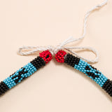 Feitas à mão, com duas linhas de nylon, miçangas de vidro, as joias refletem a beleza da floresta nos tradicionais grafismos do povo Mebengokré, autodenominação Kayapó.