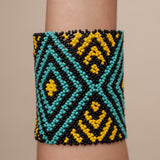 As artesãs Kamayurá aliam nessa arte o conhecimento tradicional dos grafismos à força criativa de cada artista. Elas demoram até 3 dias na criação de cada item feito com miçangas de vidro e fios de nylon.