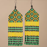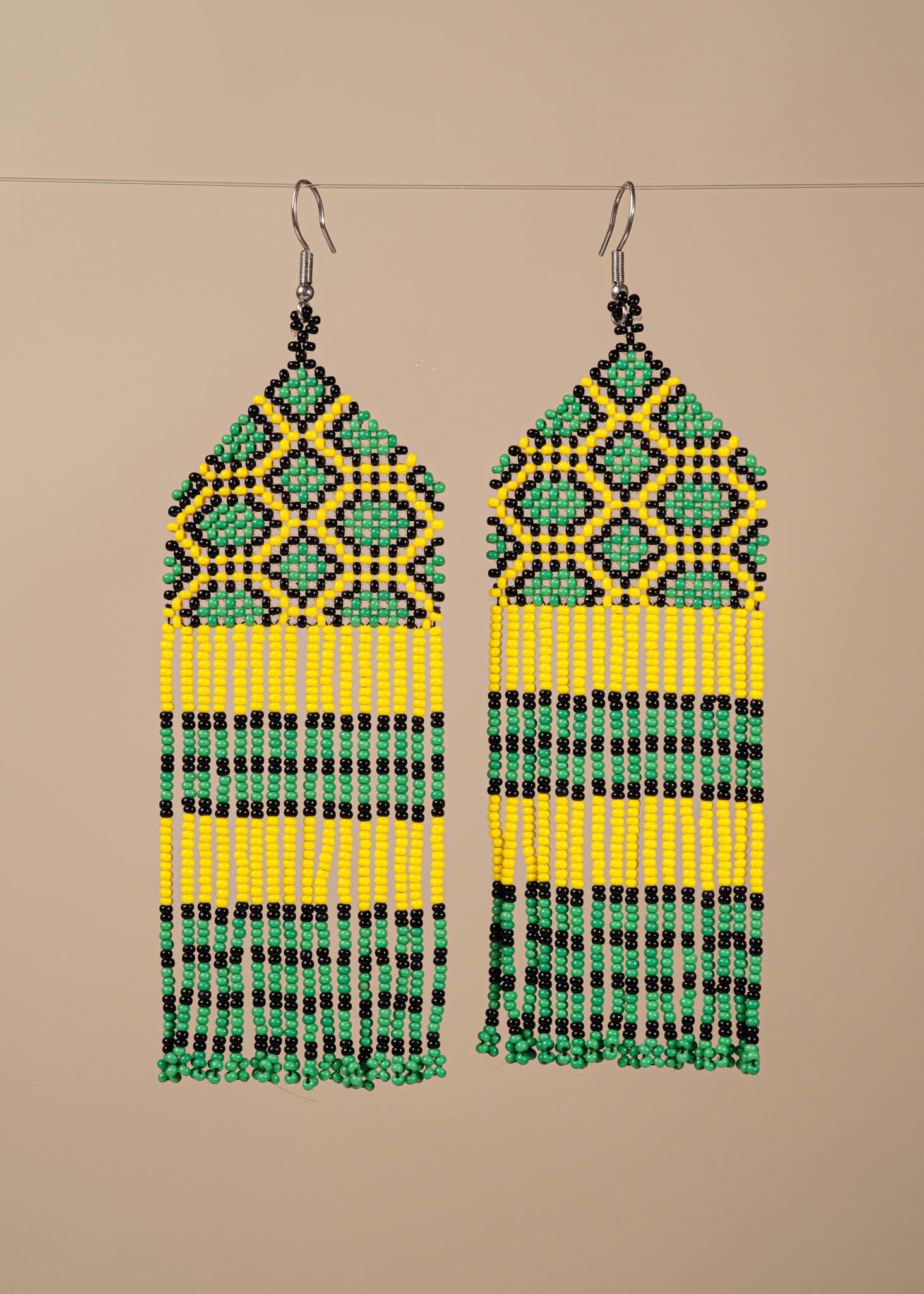 Feitas à mão, com duas linhas de nylon, miçangas de vidro, as joias refletem a beleza da floresta nos tradicionais grafismos do povo Mebengokré, autodenominação Kayapó.