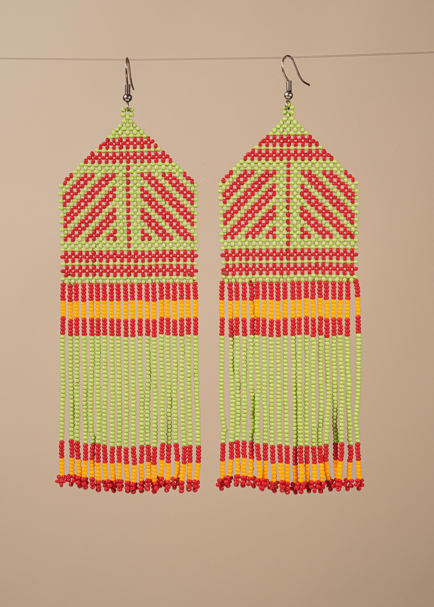 Feitas à mão, com duas linhas de nylon, miçangas de vidro, as joias refletem a beleza da floresta nos tradicionais grafismos do povo Mebengokré, autodenominação Kayapó.