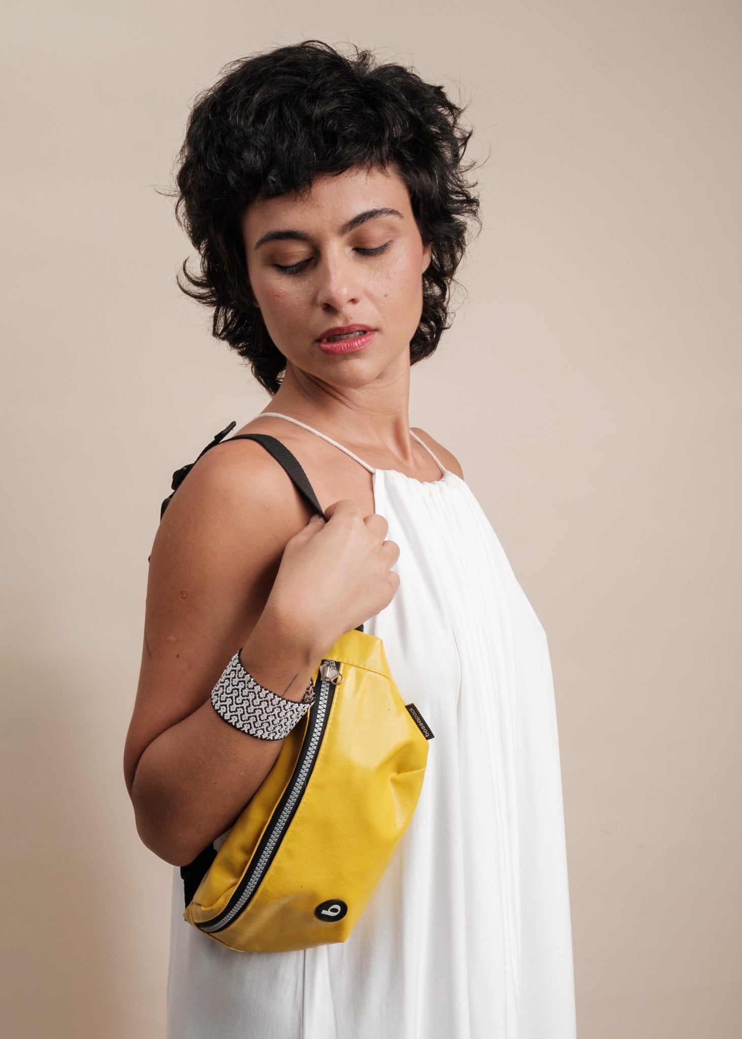 Uma pochete impermeável Bossapack, feita com um tecido 100% algodão cru com aplicação de látex pelo povo Xipaya com pigmento natural.
