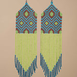 Feitas à mão, com duas linhas de nylon, miçangas de vidro, as joias refletem a beleza da floresta nos tradicionais grafismos do povo Mebengokré, autodenominação Kayapó.