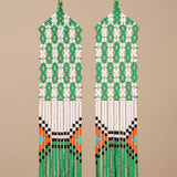 Feitas à mão, com duas linhas de nylon, miçangas de vidro, as joias refletem a beleza da floresta nos tradicionais grafismos do povo Mebengokré, autodenominação Kayapó.