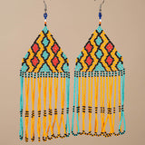 Feitas à mão, com duas linhas de nylon, miçangas de vidro, as joias refletem a beleza da floresta nos tradicionais grafismos do povo Mebengokré, autodenominação Kayapó.