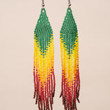 Os brincos da Artesã de Belém Gardenia Warao são criados a partir de técnicas tradicionais, usando como matéria-prima a miçanga colorida para criar peças que guardam símbolos culturais, grafismos e representações ligadas á sua ancestralidade.