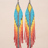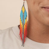 Os brincos da Artesã de Belém Gardenia Warao são criados a partir de técnicas tradicionais, usando como matéria-prima a miçanga colorida para criar peças que guardam símbolos culturais, grafismos e representações ligadas á sua ancestralidade.