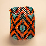 Feitas à mão, com duas linhas de nylon, miçangas de vidro, as joias refletem a beleza da floresta nos tradicionais grafismos do povo Mebengokré, autodenominação Kayapó.