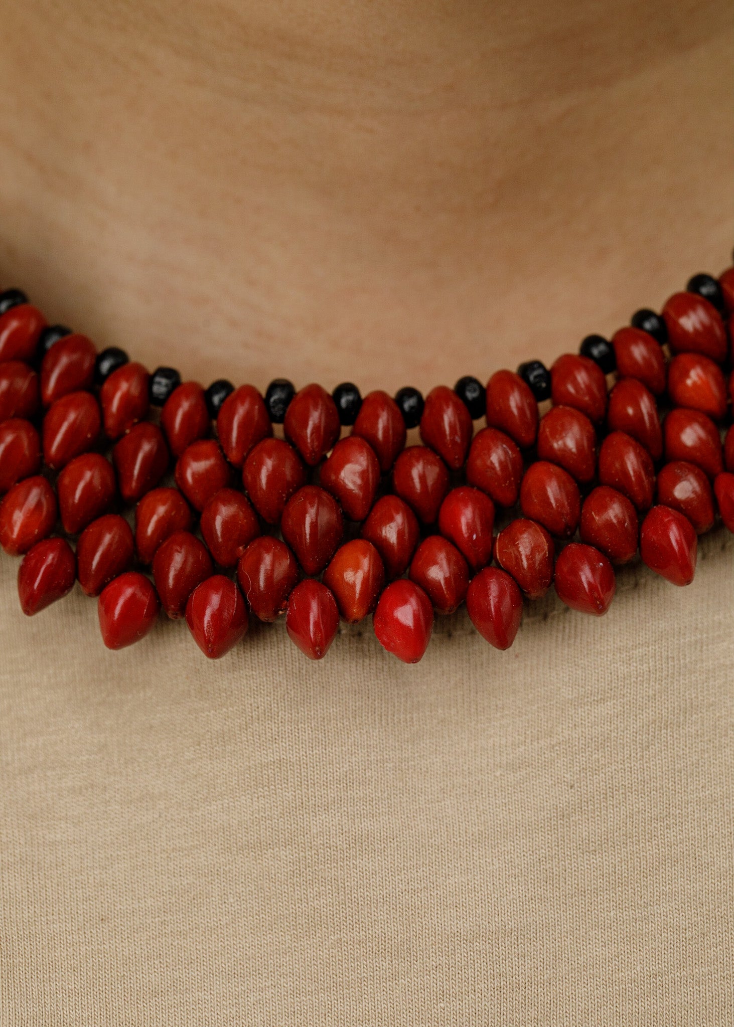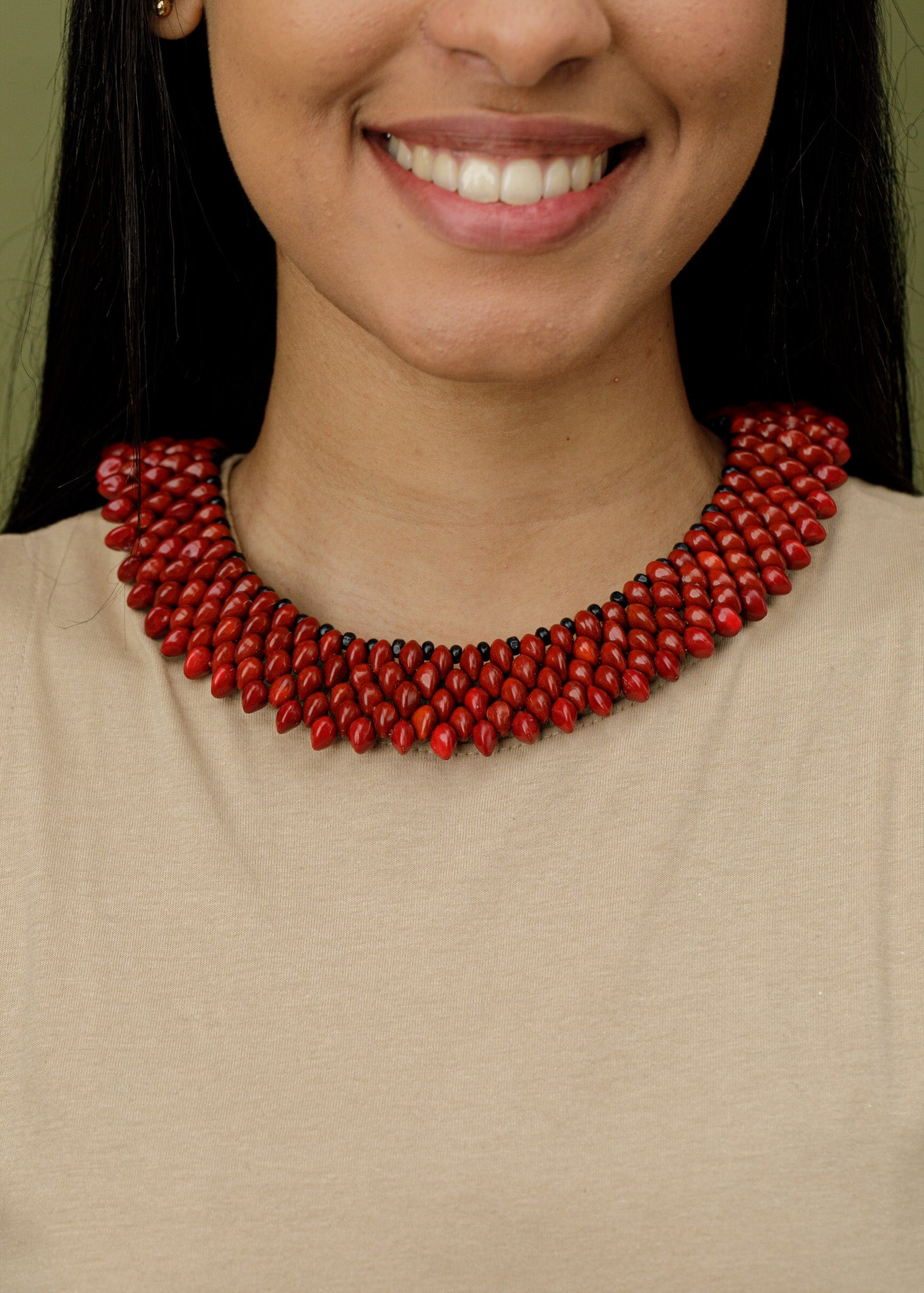 A partir de sementes coletadas nas matas e arredores de suas aldeias, as guerreiras Pataxó criam colares e gargantilhas que impressionam pela sofisticação e colorido, as sementes são tingidas ou usadas em tons naturais.