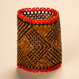 As mulheres do povo Waurá aliam nessa arte o conhecimento tradicional dos grafismos à força criativa de cada artista. Elas demoram até 3 dias na criação de cada item feito com miçangas de vidro