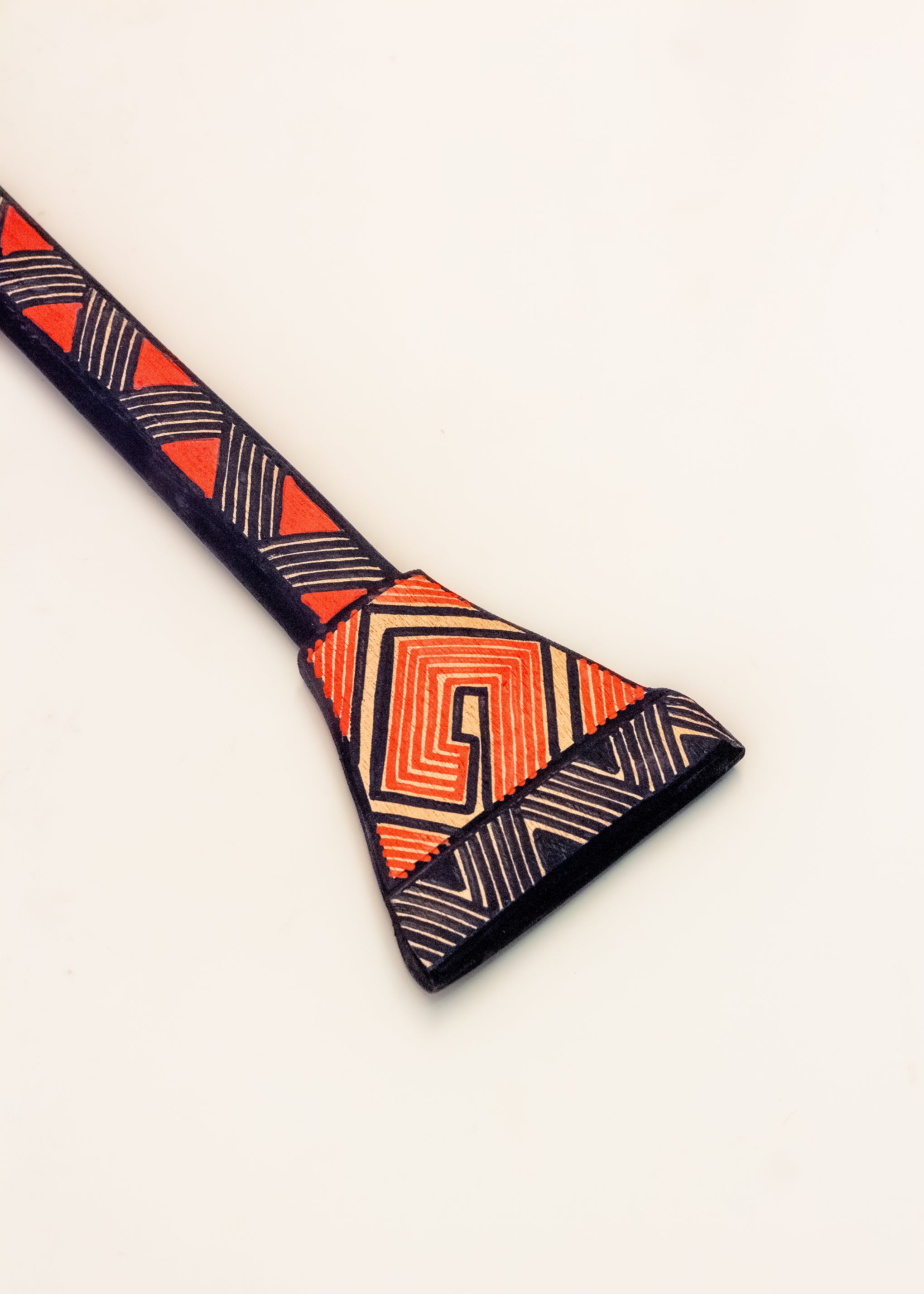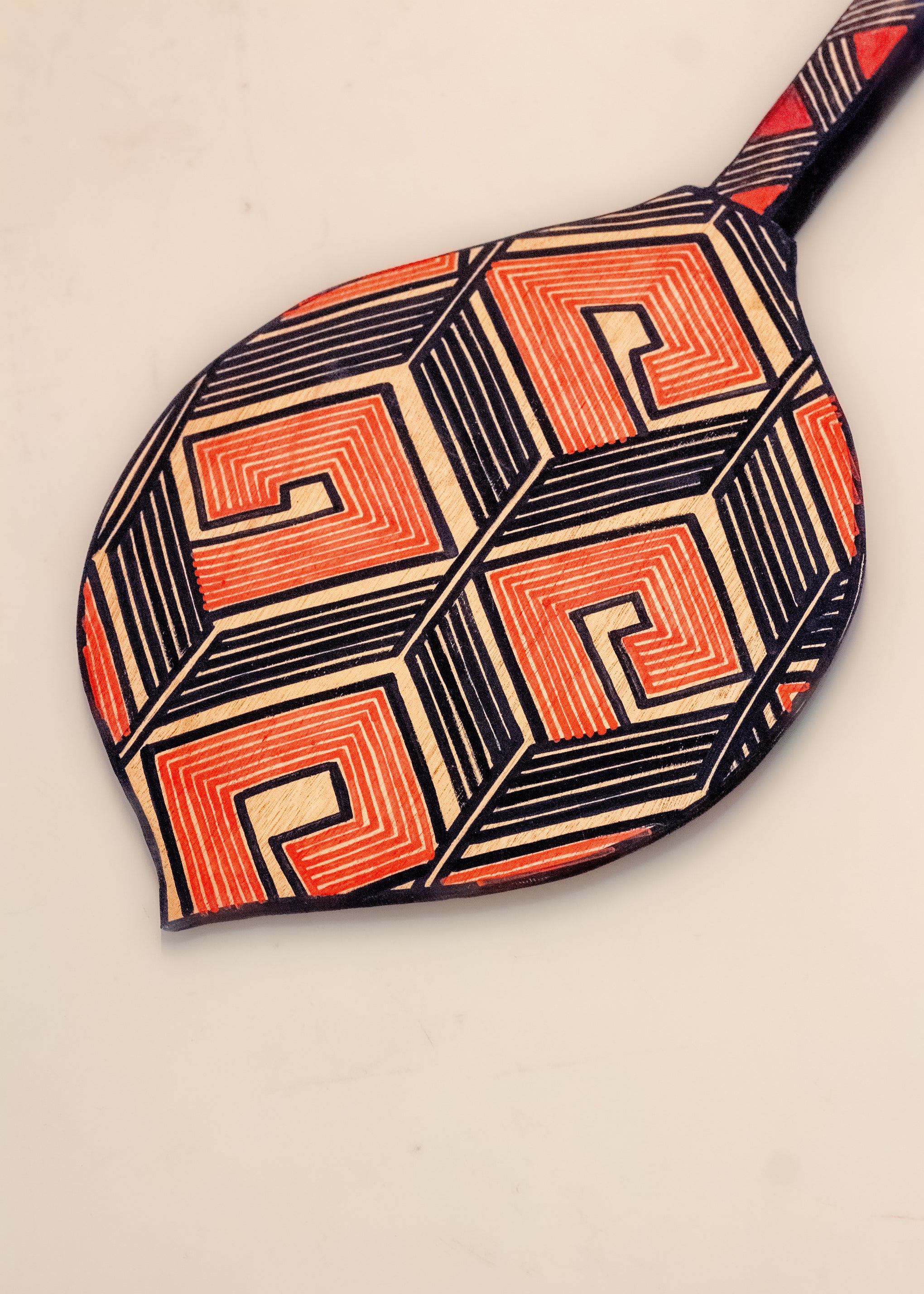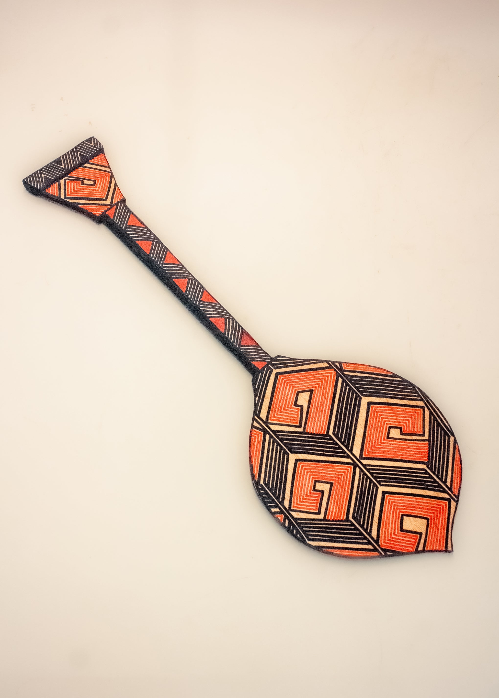 Os remos com pá circular e ponta em formato de coração, adotados pelos povos indígenas da Amazônia, são pintados com grafismos tradicionais do povo Asurini. Esses grafismos agregam valor cultural às peças, contando histórias e reafirmando a identidade Asurini.