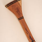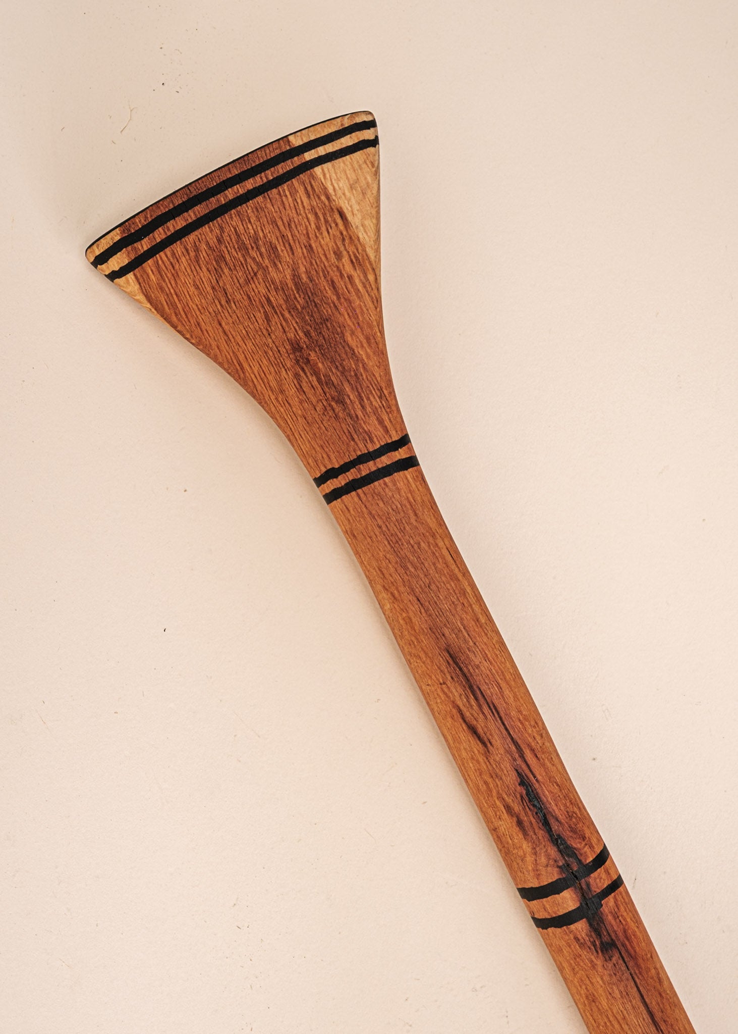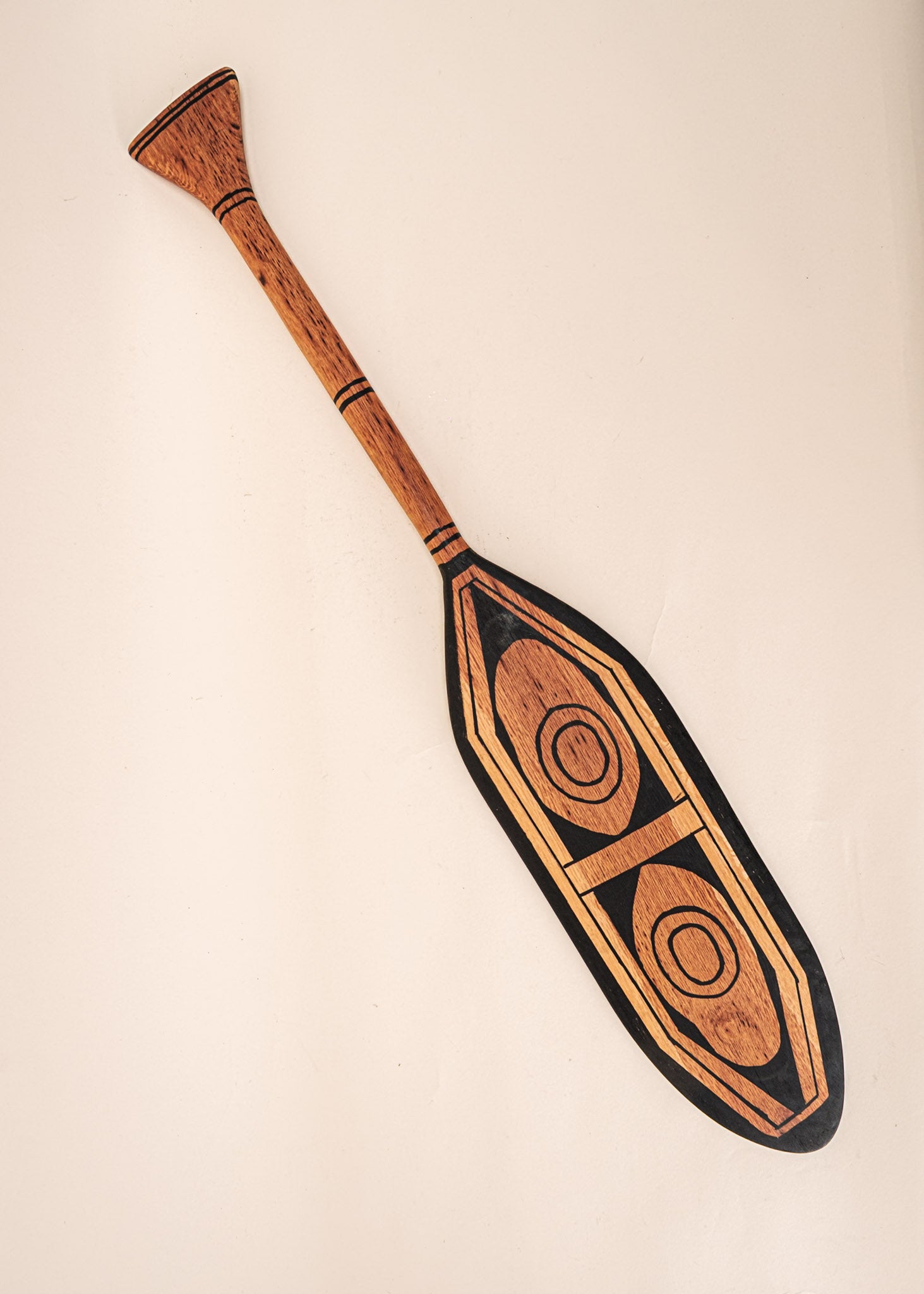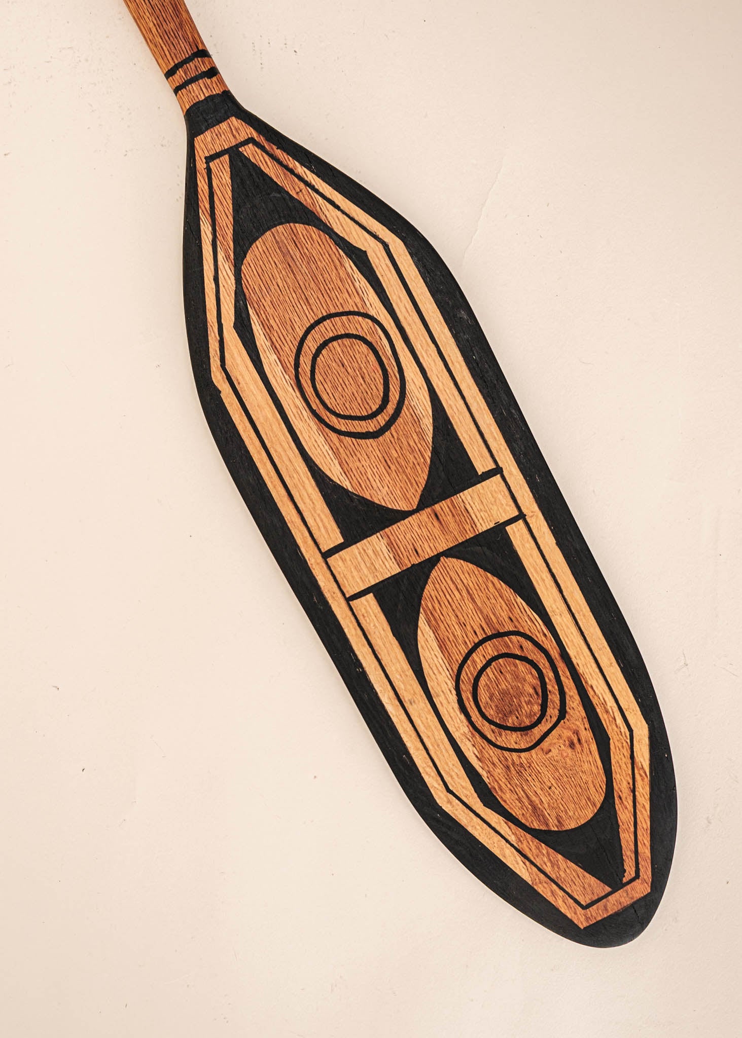 Os remos produzidos a partir de madeira de manejo sustentável e pintados à mão pelos artistas Waurá, são pintados com grafismos tradicionais.