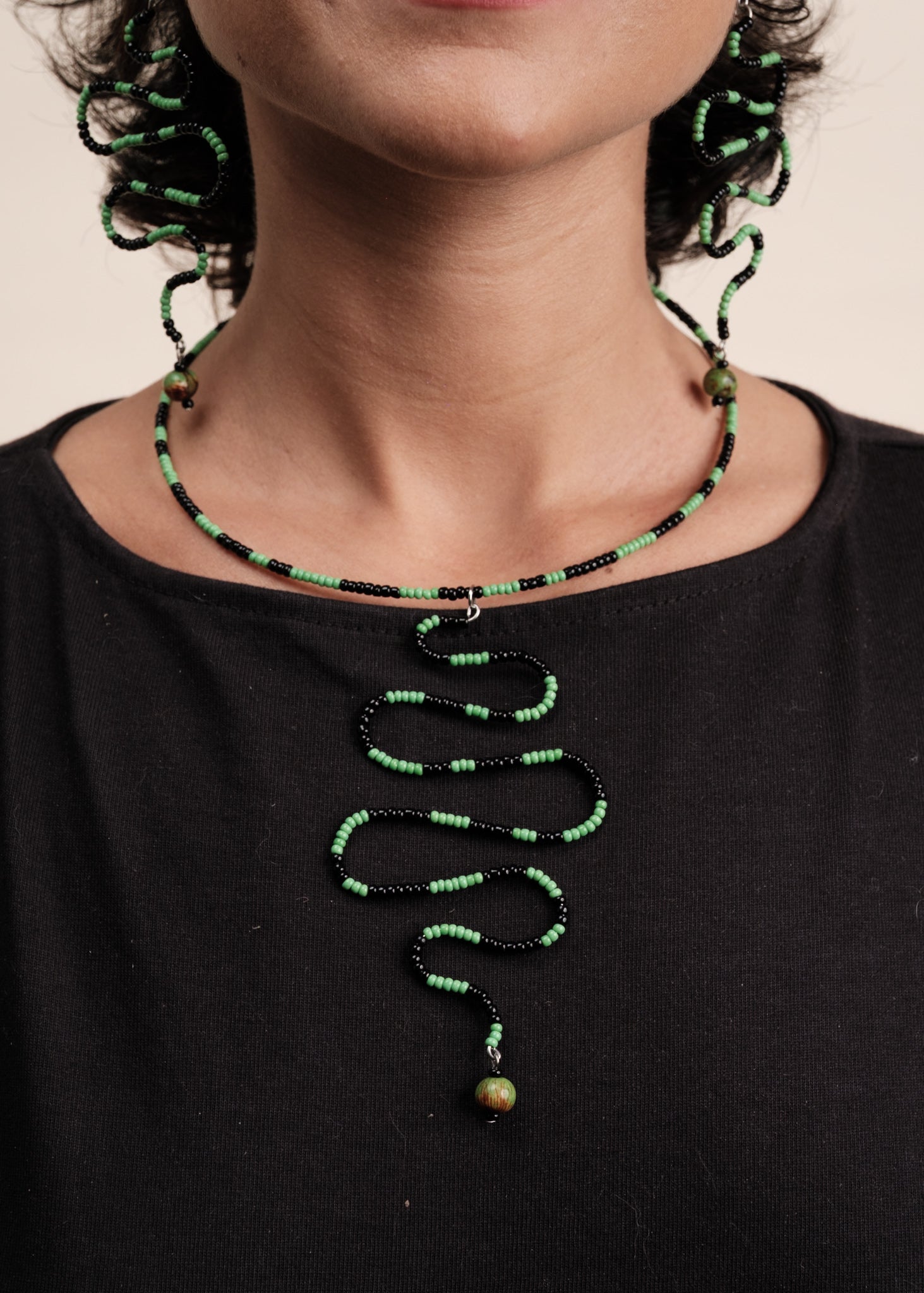 Em “Encantaria”, Jessie mergulha em novos caminhos criativos. A coleção reúne sementes, cabaças, galhos, grafismos e padrões inspirados em cobras e nas forças da natureza.