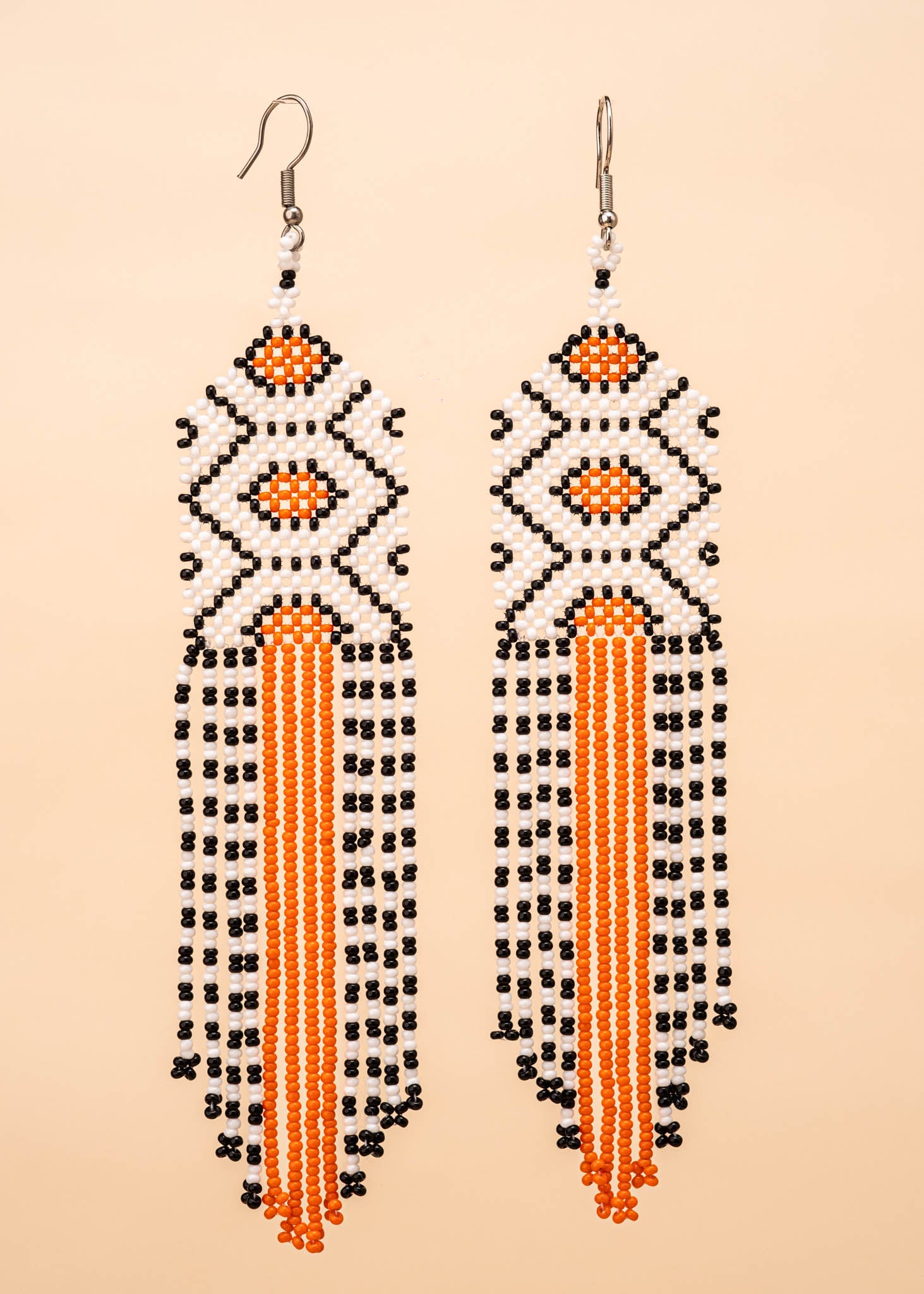 Feitas à mão, com duas linhas de nylon, miçangas de vidro, as joias refletem a beleza da floresta nos tradicionais grafismos do povo Mebengokré, autodenominação Kayapó.