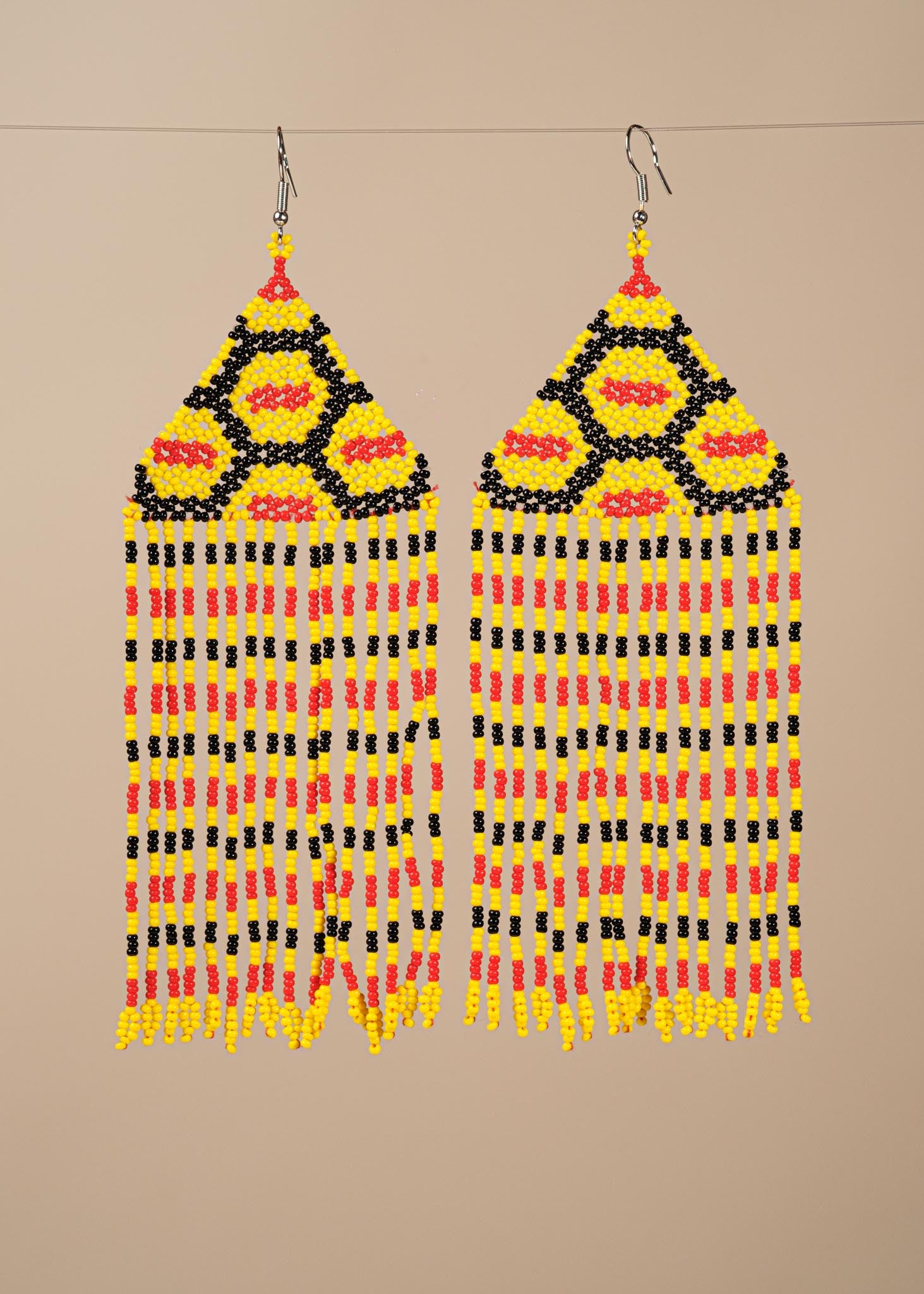 Feitas à mão, com duas linhas de nylon, miçangas de vidro, as joias refletem a beleza da floresta nos tradicionais grafismos do povo Mebengokré, autodenominação Kayapó.