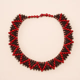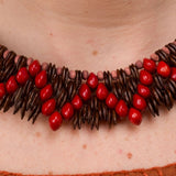 A partir de sementes coletadas nas matas e arredores de suas aldeias, as guerreiras Pataxó criam colares e gargantilhas que impressionam pela sofisticação e colorido, as sementes são tingidas ou usadas em tons naturais.