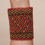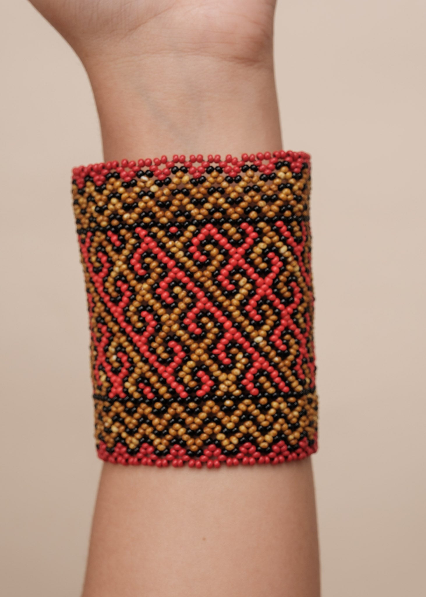 As artesãs Kamayurá aliam nessa arte o conhecimento tradicional dos grafismos à força criativa de cada artista. Elas demoram até 3 dias na criação de cada item feito com miçangas de vidro e fios de nylon.