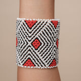 As artesãs Kamayurá aliam nessa arte o conhecimento tradicional dos grafismos à força criativa de cada artista. Elas demoram até 3 dias na criação de cada item feito com miçangas de vidro e fios de nylon.