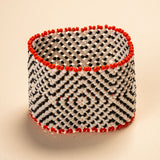 As mulheres do povo Waurá aliam nessa arte o conhecimento tradicional dos grafismos à força criativa de cada artista. Elas demoram até 3 dias na criação de cada item feito com miçangas de vidro
