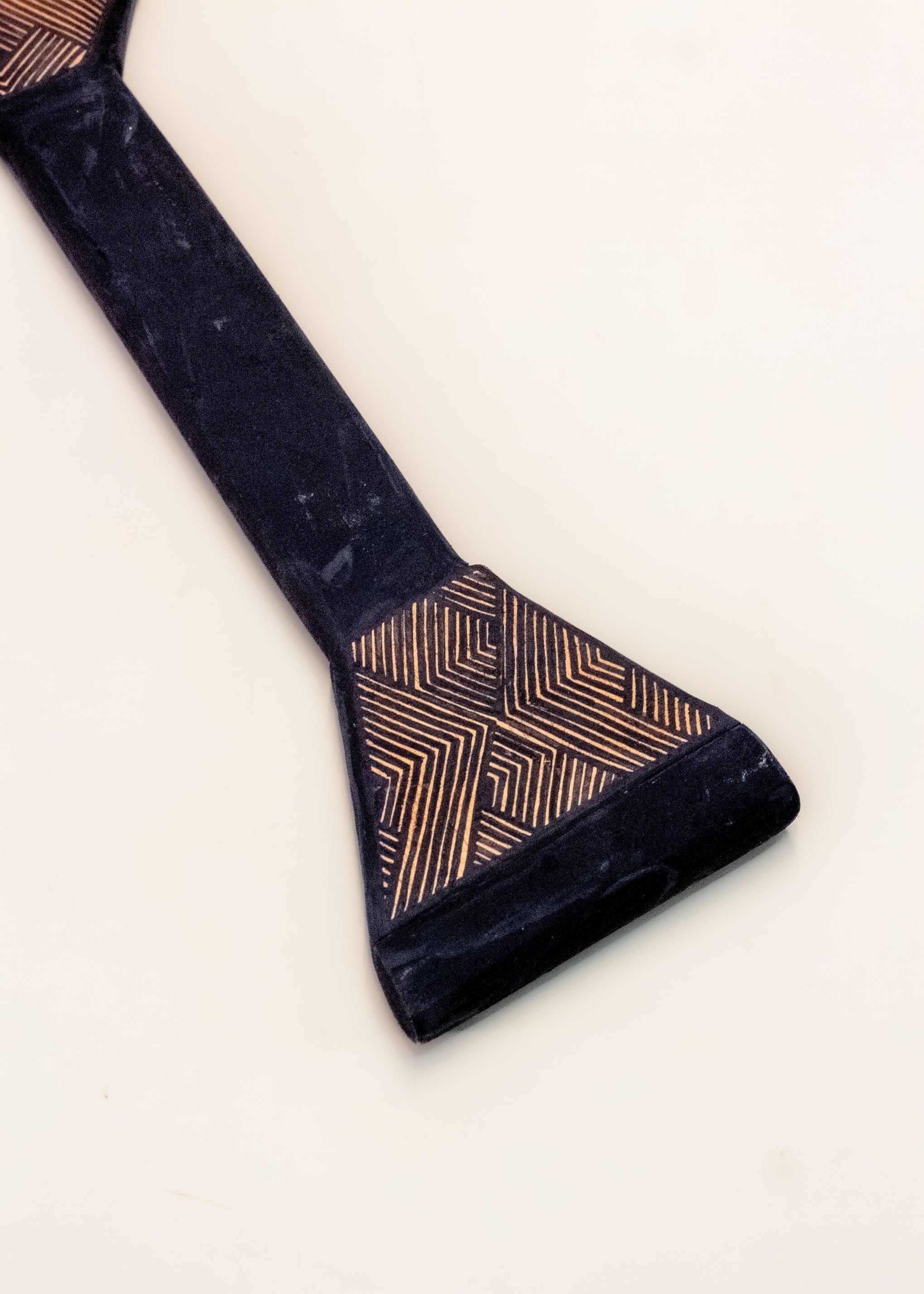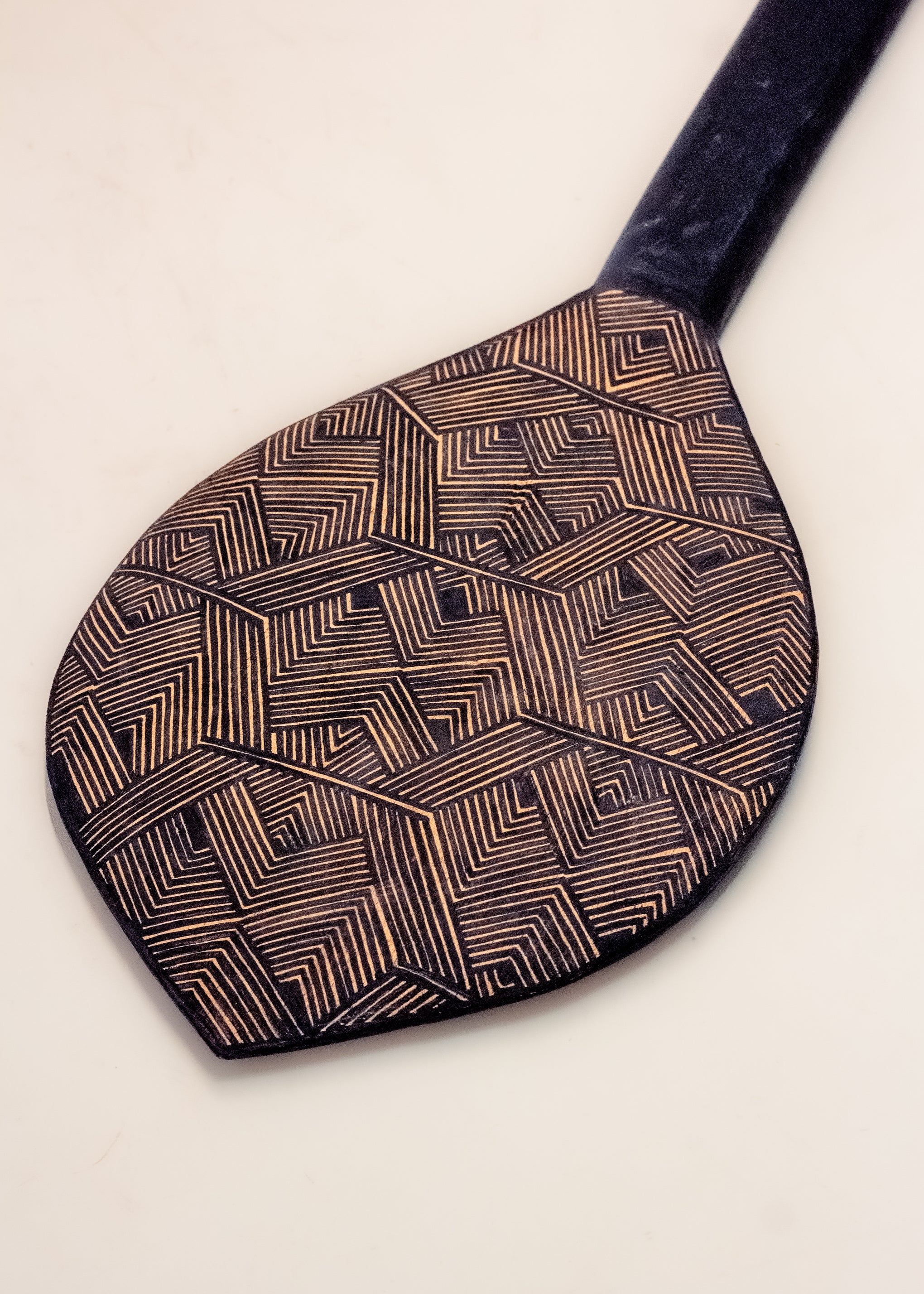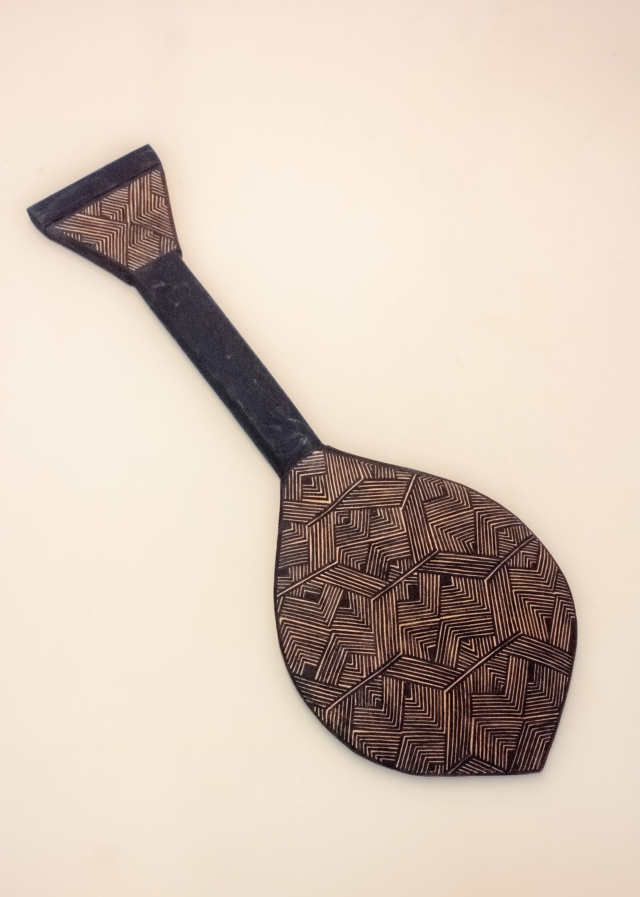 Os remos com pá circular e ponta em formato de coração, adotados pelos povos indígenas da Amazônia, são pintados com grafismos tradicionais do povo Asurini. Esses grafismos agregam valor cultural às peças, contando histórias e reafirmando a identidade Asurini.