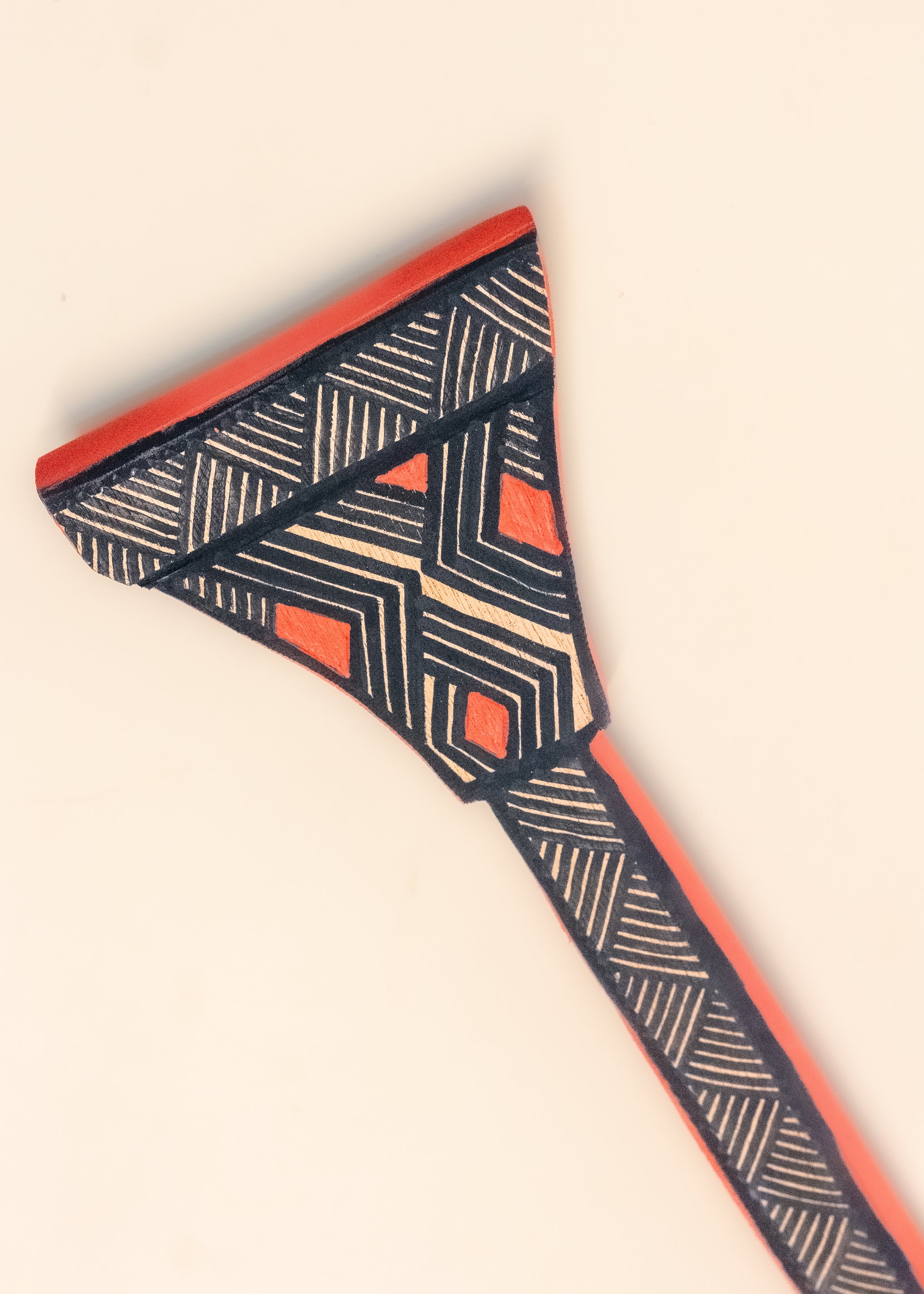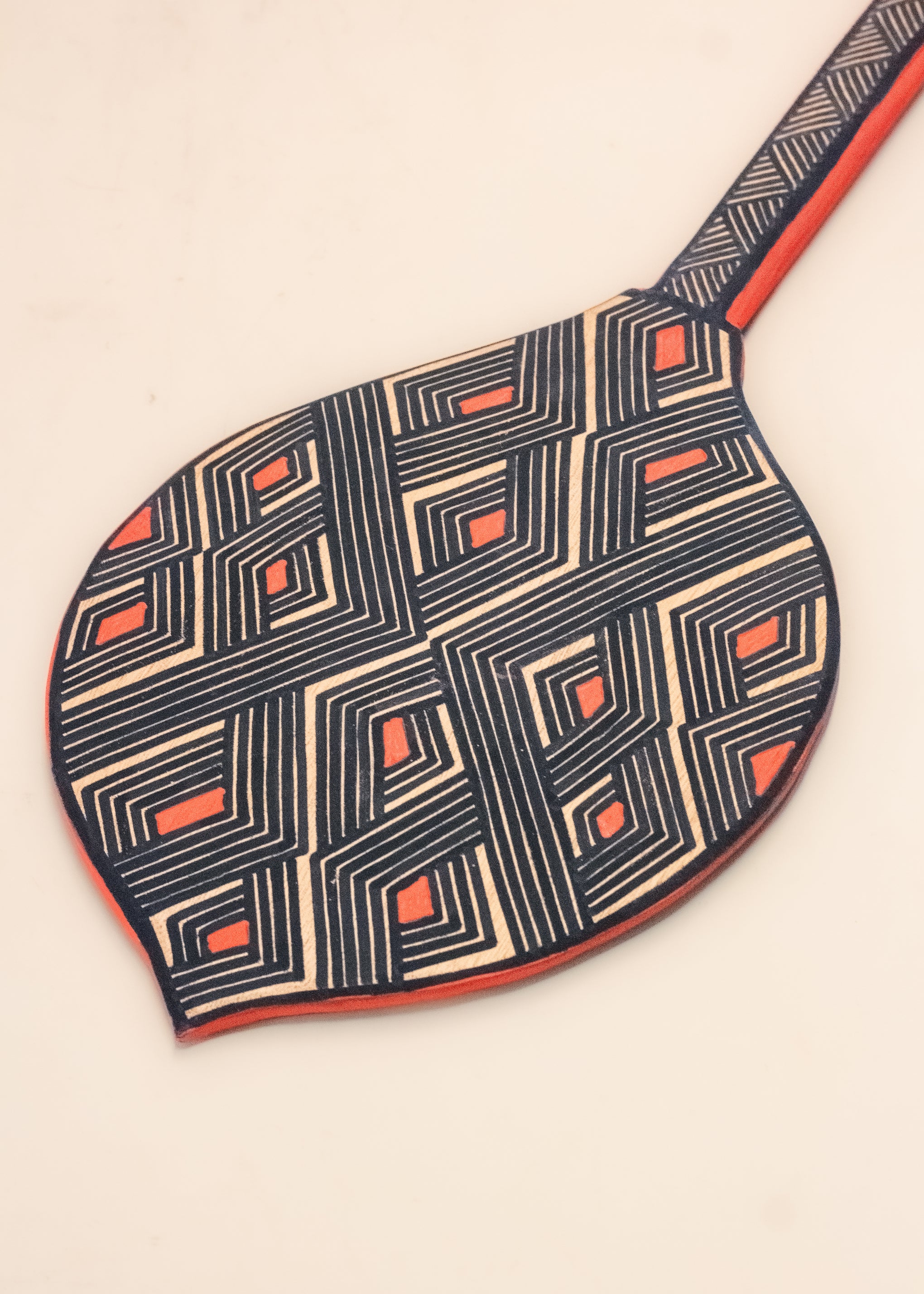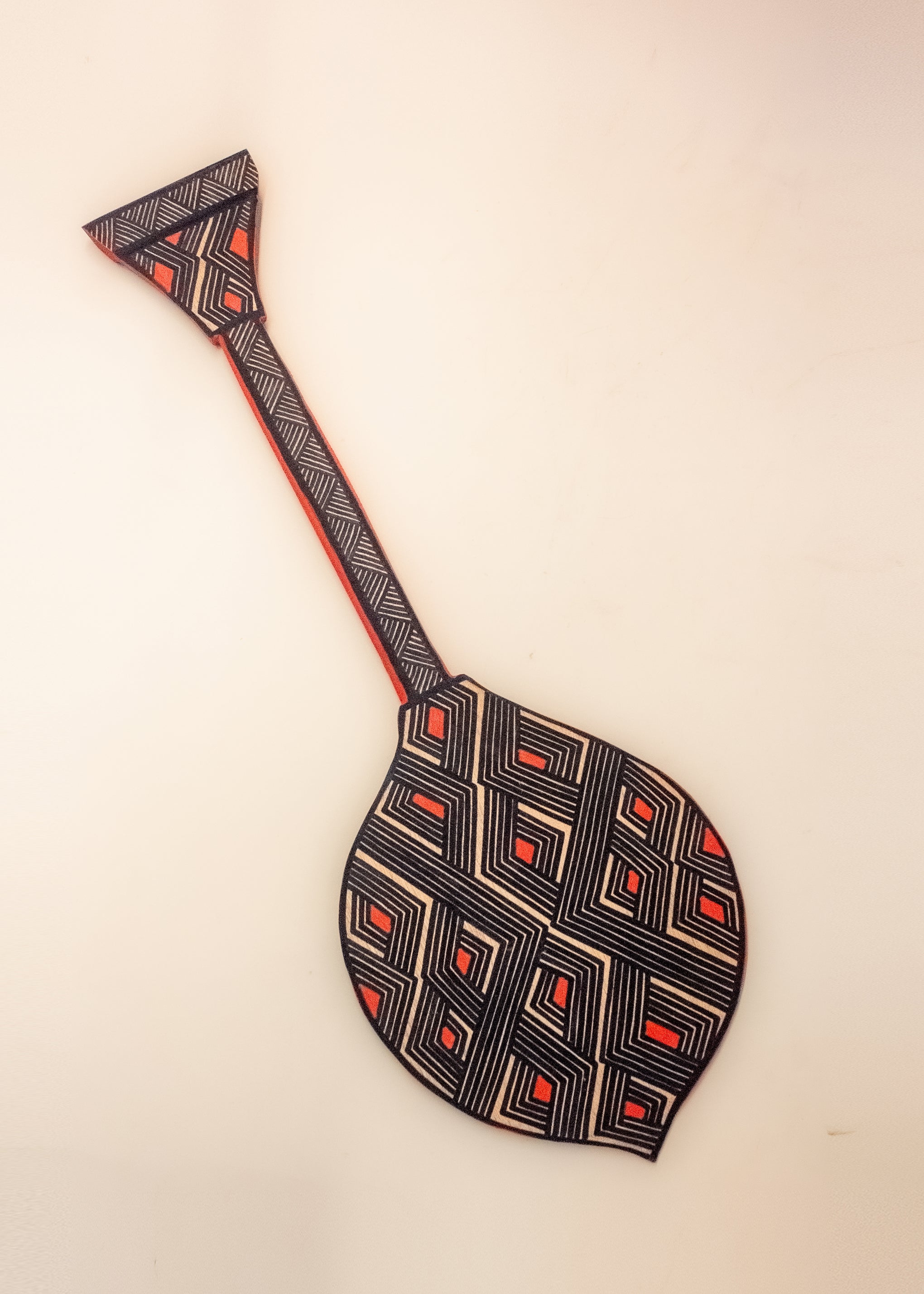Os remos com pá circular e ponta em formato de coração, adotados pelos povos indígenas da Amazônia, são pintados com grafismos tradicionais do povo Asurini. Esses grafismos agregam valor cultural às peças, contando histórias e reafirmando a identidade Asurini.